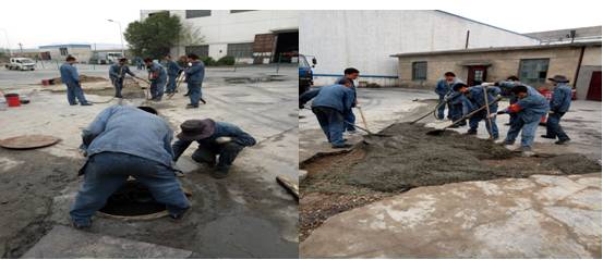 時(shí)至夏日,天氣多變。臨時(shí)土建維修隊(duì)充分發(fā)揮車間人員中懂得土建施工技能的優(yōu)勢,悉心謀劃,從職工家中借用攪拌機(jī)等施工機(jī)械,加班加點(diǎn)有序進(jìn)行著屋面防水修復(fù)、路面地基處理、排水溝的修復(fù)等維修工作。在公司車隊(duì)密切配合下,截至6月4日共修復(fù)屋面防水358平方米,路面維修290平方米、路基整修87立方米,排水溝修復(fù)15米,生產(chǎn)廠區(qū)道路破裂,瀝青澆灌等各項(xiàng)工作。