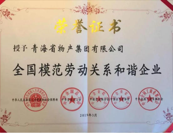由青海省人力資源和社會保障廳、青海省總工會、青海省企業(yè)聯(lián)合會/企業(yè)家協(xié)會、青海省工商業(yè)聯(lián)合會共同推薦申報,青海省物產(chǎn)集團(tuán)有限公司、青?;ブ囡乒煞萦邢薰尽⒄铰窐蚪ㄔO(shè)股份有限公司榮獲全國模范勞動關(guān)系和諧企業(yè)光榮稱號,西寧經(jīng)濟(jì)技術(shù)開發(fā)區(qū)東川工業(yè)園區(qū)榮獲全國模范勞動關(guān)系和諧工業(yè)園區(qū)光榮稱號,受到了國家人力資源和社會保障部、中華全國總工會、中國企聯(lián)、全國工商聯(lián)的隆重表彰。