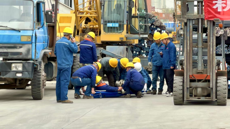 本次演練模擬鋼板區(qū)在進(jìn)行吊裝作業(yè)時(shí)突發(fā)輪胎起重機(jī)吊裝貨物擺幅過大傷人事故。演練前期,制定了詳細(xì)方案并組織培訓(xùn),籌備救援、醫(yī)療等物資,布置模擬場景。演練啟動(dòng)后,通訊聯(lián)絡(luò)組迅速傳遞事故信息,現(xiàn)場指揮組即刻啟動(dòng)應(yīng)急響應(yīng)。警戒疏散組快速隔離現(xiàn)場、疏散人員;應(yīng)急救援組解救受傷人員、排除設(shè)備故障;醫(yī)療救護(hù)組對傷員緊急救治并送醫(yī);后勤保障組及時(shí)供應(yīng)物資,各環(huán)節(jié)有序推進(jìn)。